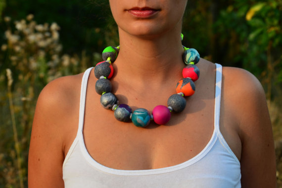 This collection in my opinion can be described as chic simplicity with a touch of multi-cultured facets. The owner of this shop, Nao, creates these lovely eco-friendly chunky necklaces from African clothing and uses polymer textile clay hoops to accessorize the choker of the necklaces. She also designs bracelets to match the bold necklaces and also creates thinner, minimalistic necklaces for the more simply accessorized woman. The fascinating thing about her designs is that you can purchase several different color clay hoops to mix and match back to your outfit of the day. Her use of ethnic blending translates to bold and beautiful accessories that can be worn on day-to-day basis. Nao was incredibly generous enough to send me one of my very own handmade necklaces to keep.