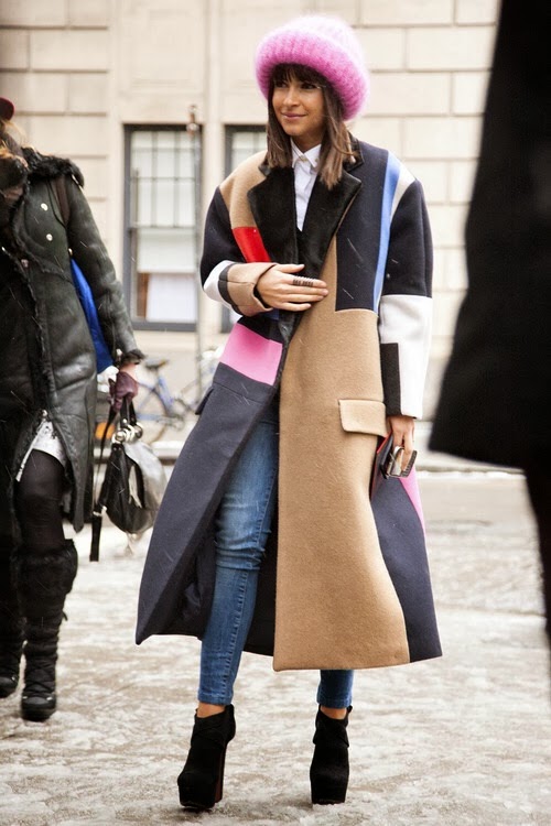 Due to low temperatures all around the country this week, everyone needs to follow the lead of style guru (and my personal favorite icon) Miroslava Duma. When I see this lovely lady in winter attire, I literally want it to snow everyday of the year. She does winter chic with such pizazz and in her photos it always seems as if she could care less about the negative degree temperatures. Here she is shown wearing denim skinnies, high to the sky black suede wedged booties, and a color blocked coat with leather appliqués. The mod 50s pink fur hat is the cherry on top to a fabulous outfit.