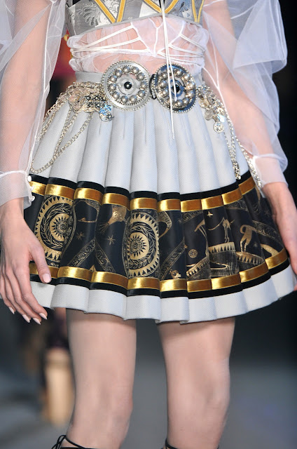 This is a professional shot from one of John Galliano’s runway collection. The colors and designs that he incorporated into this look reminds me of the history of ancient countries like Greece or Egypt. The look is more modernized and I love the details like the gold trimming and statement chained-belt. You can’t really see it in the picture, but the model is wearing black tie-up sandals, which I think is amazing for this whole creation. Galliano always amazes on the runway!