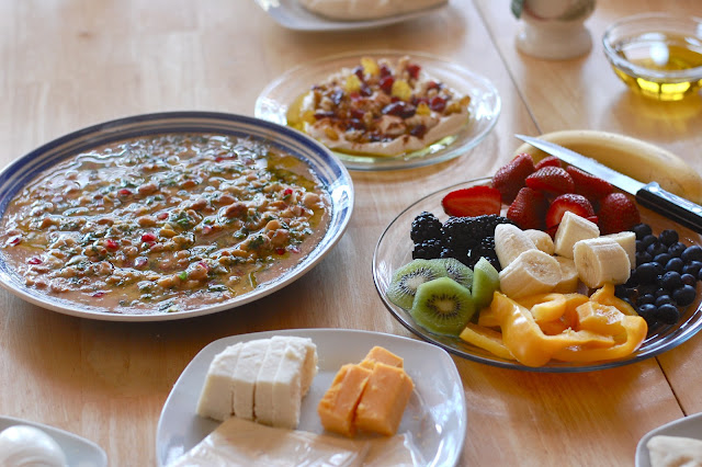 {my amtos delicious breakfast consisting of fruits, cheese, foul, & labneh}