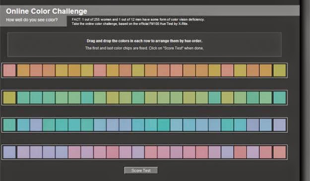 3. This online challenge asks you to line up colors based on their hues. Unfortunately, I got a score of 46 (the closer to 0, the better).