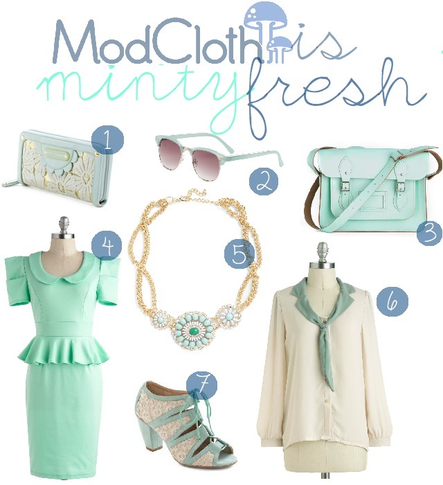 Okay, so I think I’m a little obsessed with ModCloth. Every time I get a chance to browse through their things, I start developing a wish list of items that I need to save up for. Their combination of vintage and modern clothing alone makes me excited about all the new stuff my closet must own. Since mint seems to be every where this season {here, here, and here}, I’ve compiled some of my favorite minty fresh pieces from ModCloth!
