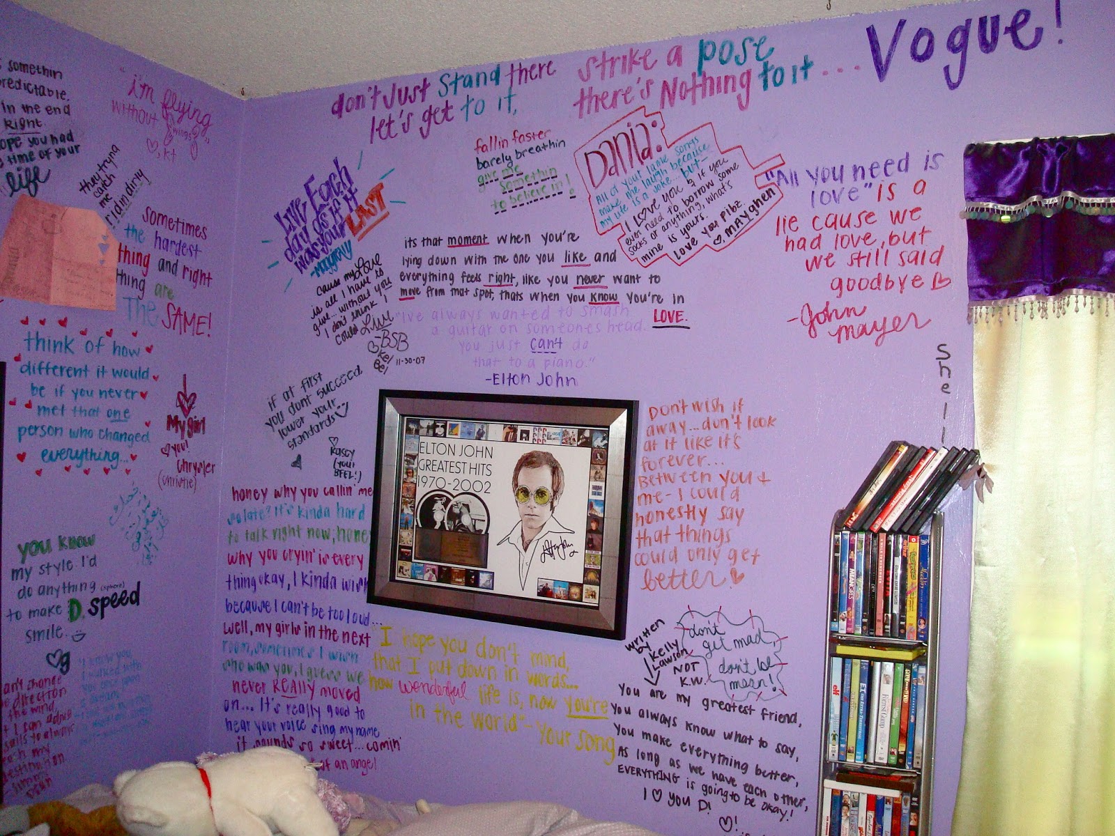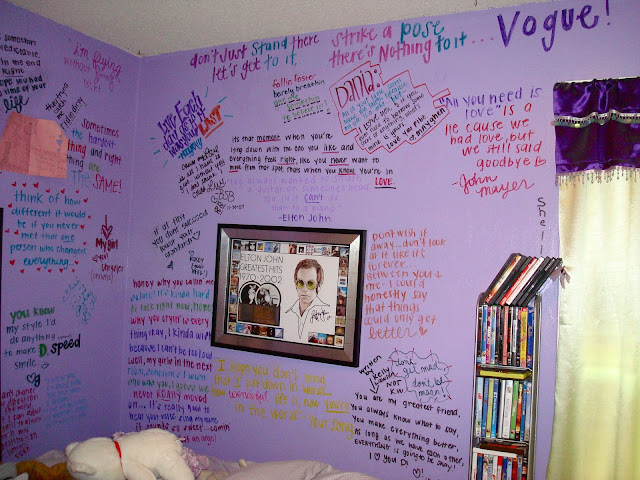 I guess it’s been 5 years now since my family moved out of our old home. A good 15 years was spent there- but these pictures are a constant reminder of a very specific time– my teenage years. I remember the exact moment that my creativity quote wall began. I was sitting in my {plain} purple painted room, when I heard the door ring. A UPS man was standing with a big package asking me if I could sign. I was a little young then, but when I saw my name on the package my eyes grew wide. The moment I opened it, I realized that I was one of the luckiest girls in the world. My father bought me a signed plaque by Elton John {my favorite singer} from Las Vegas. It was 1 out of only a 1000 in the world. Elton John meant so much to me growing up, his lyrics helped me out of a slump in my life.. so getting this plaque meant to the world to me. I hung it up in my room, and wrote on the wall: