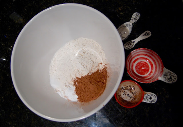 1.5 cups (+ 1 TBS) of flour, 1/4 unsweetened cocoa powder,