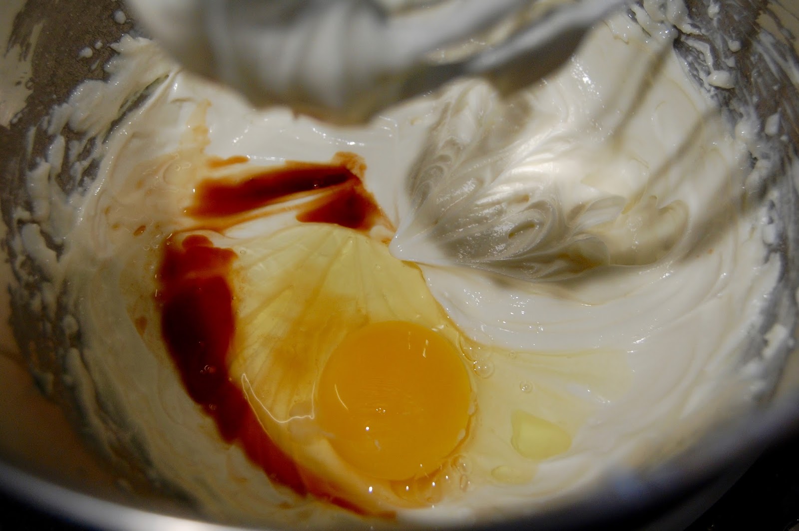 Add a room temperature egg and 1 tsp vanilla and beat again until combined.